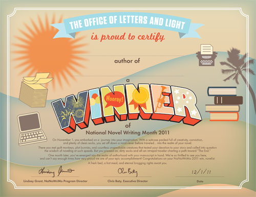 J’ai triomphé (de justesse remarquons-le) de mon tout premier NaNoWriMo. Enfin, pour être correct, j’ai triomphé des 50 000 mots (plus de maigres centaines), même si mon projet n’est pas encore terminé. La fierté me vient surtout du fait que je n’y croyais plus vraiment sur la fin, et que j’ai dû écrire les 10 000 derniers mots en plus ou moins deux jours : une expérience désagréable qui m’a rappelé tant de dissertations bâclées à la lumière de ma lampe de chevet et à rendre pour le lendemain matin… Je remercie au passage ceux qui m’ont encouragé durant ces derniers jours, tout spécialement Pauline Doudelet qui aura été un peu mon mentor durant cette expérience !
