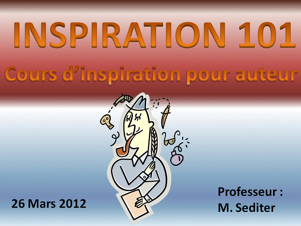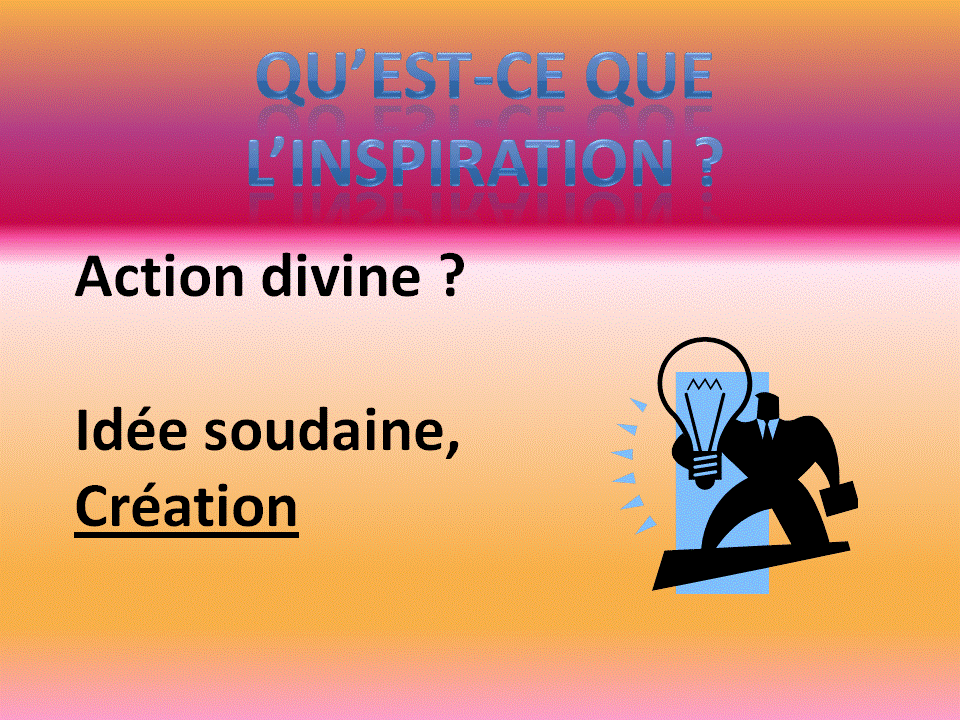 Pour répondre tardivement à la question du premier slide, l’inspiration est donc une poussée, une aide, mais en rien un moteur. Vous aurez la volonté d’écrire un livre, l’inspiration vous aidera à le faire.