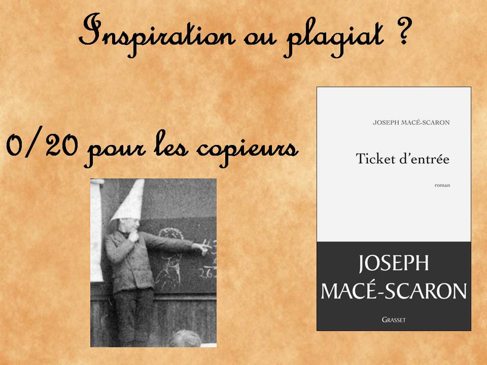 Brutal de reprendre déjà à la prochaine slide n’est-ce pas ? Inspiration ou plagiat, voilà une étape incontournable de ce cours, étape pour laquelle ont spécialement été conviés quelques auteurs de Gallimard, non pas pour donner des leçons, mais pour en prendre cette fois-ci ! Car chacun sait qu’il est difficile de reconnaître cette imperceptible limite entre l’inspiration et le plagiat, surtout à cette époque ou le copier-coller peut être considéré comme un hommage officieux.