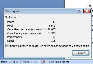 Sur Word, par exemple, le nombre de mots d’un document est indiqué directement en bas à gauche de la page. Notez d’ailleurs que si vous cliquez dessus, vous aurez accès à toutes les statistiques de votre document, ce qui fera toujours la joie des statisticiens :